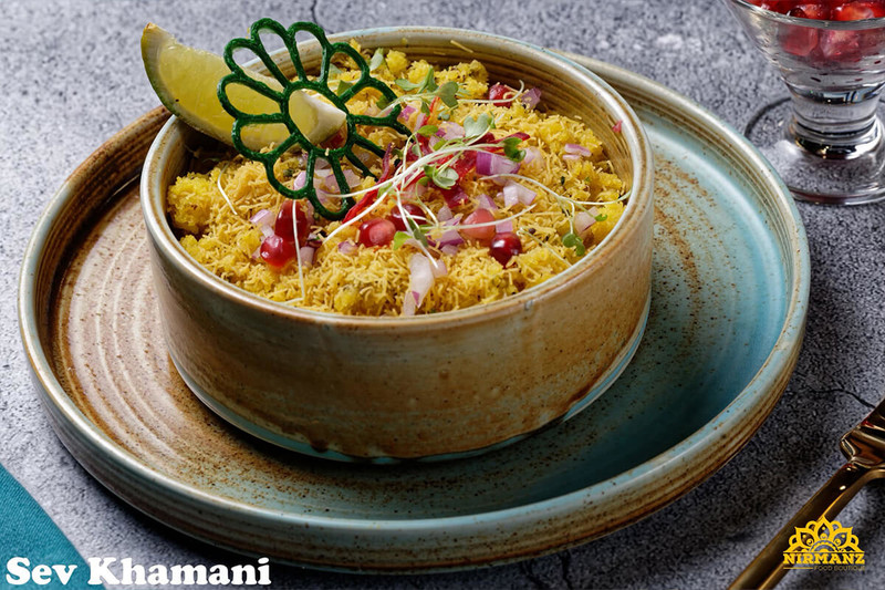 savory steamed gram flour sponge cake topped with yogurt chutneys masala and sev